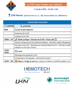 👉 De la création de la FAV à sa surveillance, en passant par les complications et les techniques de ponction, chaque étape sera explorée en profondeur à travers des présentations claires, des démonstrations pratiques et des échanges concrets.